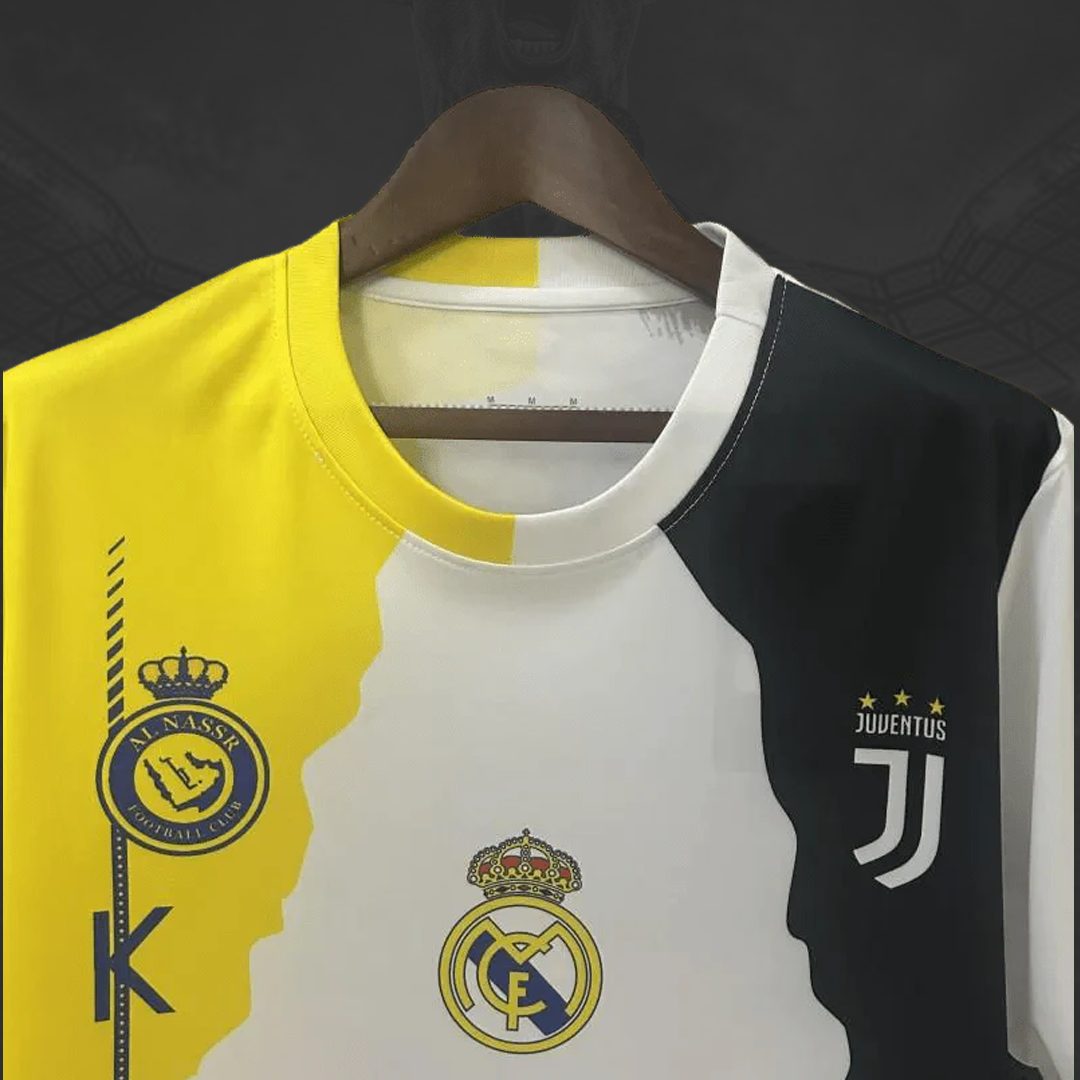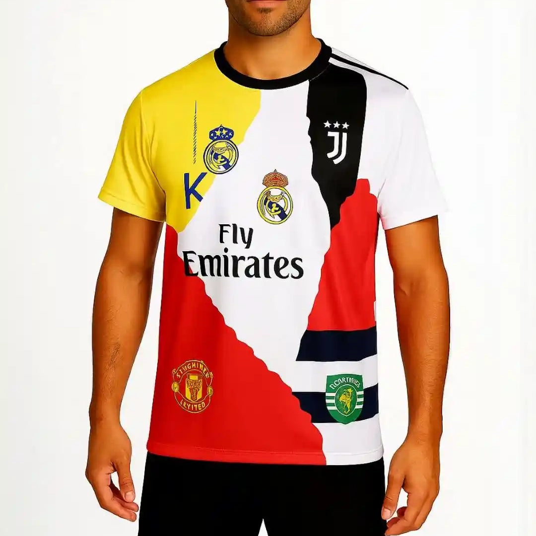 Celebrando la trayectoria única de Cristiano Ronaldo, esta jersey reúne a todos los clubes y la selección que marcaron su carrera: Sporting, Manchester United, Real Madrid, Juventus, Al Nassr y Portugal.
